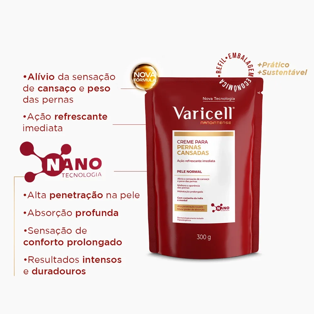 É um creme desenvolvido para aliviar a sensação de cansaço e peso nas pernas. Varicell® Nanointense Creme Pele Normal promove alívio imediato, com ação refrescante, melhorando no relaxamento das pernas e proporcionando uma sensação de conforto prolongado. Sua tecnologia exclusiva Nanointense potencializa a absorção dos ativos, permitindo que penetrem nas camadas mais profundas da pele graças ao uso avançado da nanotecnologia.